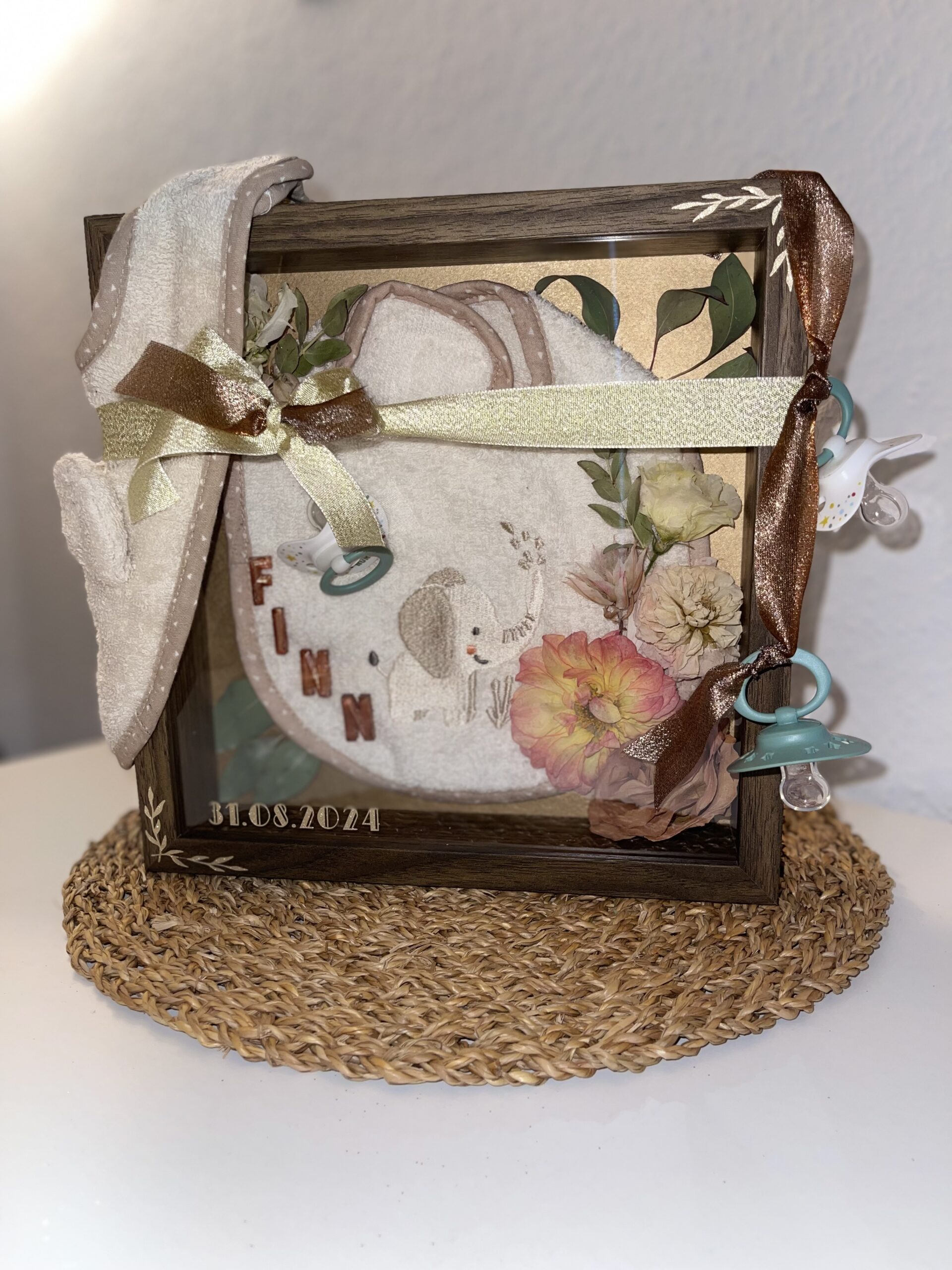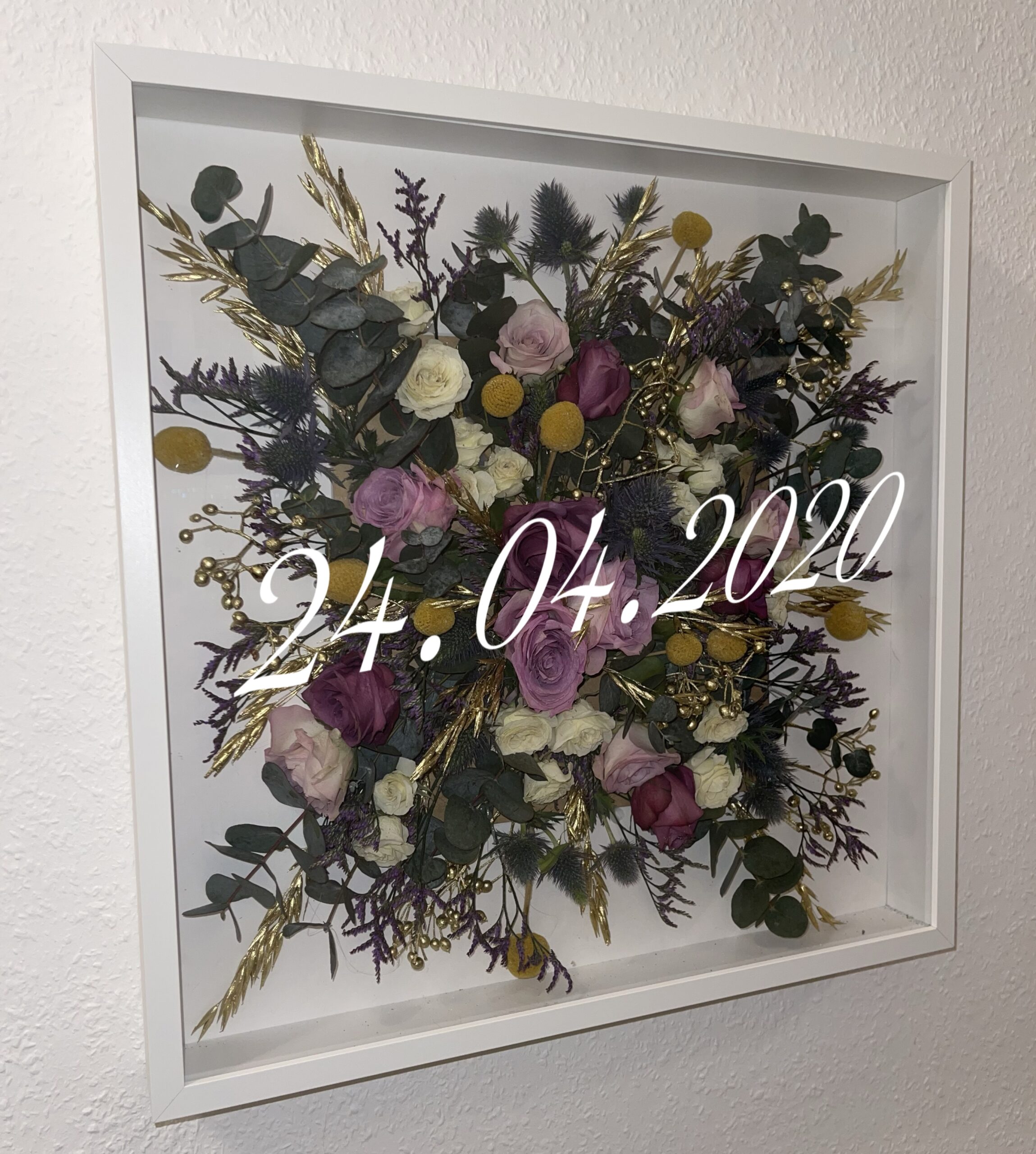 •Brautstrauß im Bilderrahmen: Deine Blumen werden sorgfältig getrocknet und kunstvoll in einem Bilderrahmen arrangiert. Optional kannst du den Rahmen mit deinem Namen und/oder Hochzeitsdatum beplotten lassen – für eine ganz persönliche Note.